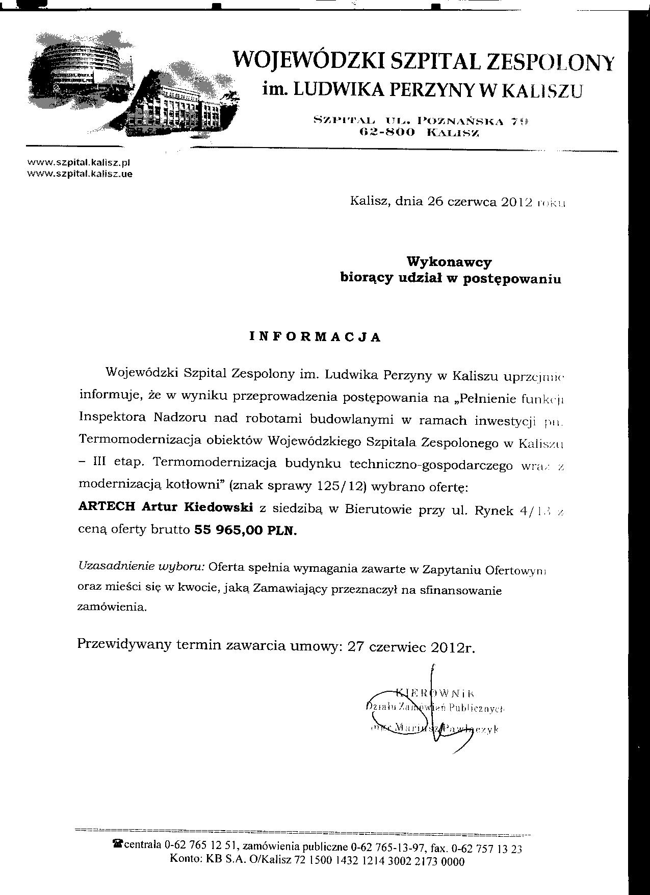 szpital.kalisz.pl › Zamówienia publiczne › 13.06.2012r._Pełnienie funkcji Inspektora Nadzoru nad robotami budowlanymi w ramach inwestycji pn. Termomodernizacja obiektów Wojewódzkiego Szpitala Zespolonego w Kaliszu – III etap. Termomodernizacja budynku techniczno-gospodarczego w